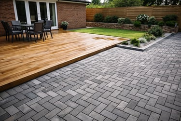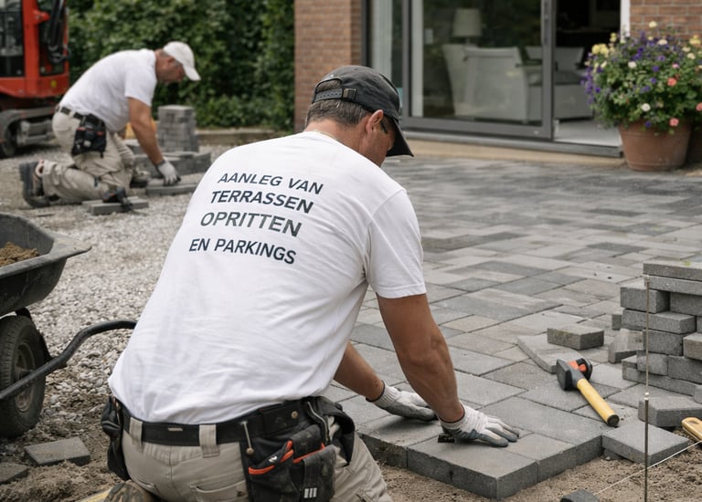 Aanleg van terrassen, opritten en parkings met sterke fundering en correcte afwatering.